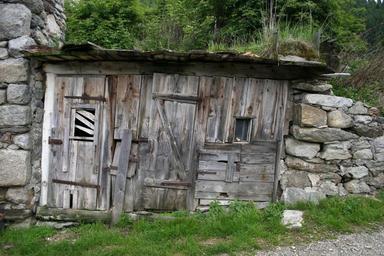 Keywords: shed shack hut rustic building structure mountain stone wall house abandoned roof weathered wood exterior cabin empty remote timber austria country