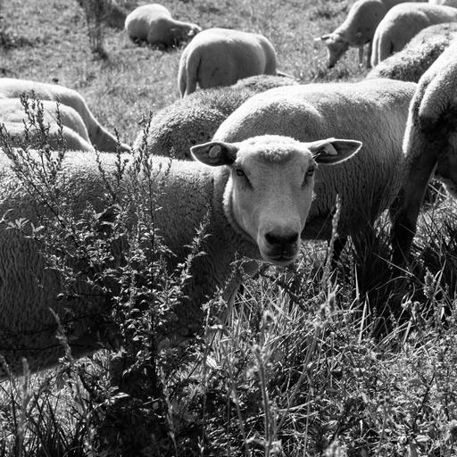 Keywords: sheep graze eat outdoor nature livestock flock of sheep flock tierhaltung welfare bio eco eye contact see hunger grass