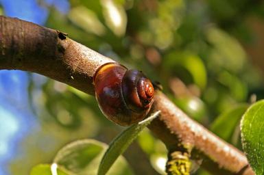 Keywords: shell nature snail wood close animal sunbeam rest branch brown snail crawl garden pear beautiful day green leaves