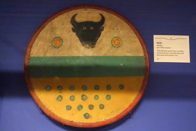 | Keywords: Shield, Siksika, late 19th century, rawhide over wooden disk - Glenbow Museum - DSC00770.JPG en Exhibit in the Glenbow Museum 130 9th Ave S E Calgary Alberta Canada This work is old enough so that it is in the public domain Photography was permitted in the museum without restriction 2013-09-21 12 11 32 own Daderot cc-zero Shields in the Glenbow Museum Uploaded with UploadWizard Siksika artefacts American shields | ||||