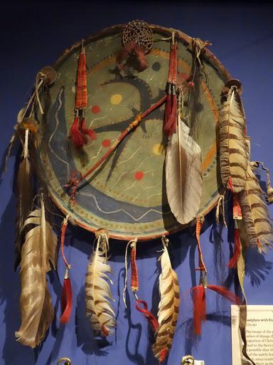 | View Original: | Shield with thunderbird and moon designs, Sioux, late 19th century, hide over wooden hoop with feathers, horse hair, porcupine quills, metal cones - Glenbow Museum - DSC00733.JPG (3648x4861) | |||