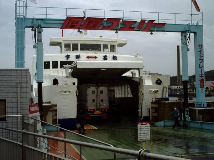 Keywords: Shikokuferry uno port.jpg ja 宇野港側の四国フェリー乗り場 徒歩の旅客は 車両と同様 車両甲 から乗下船する 人撮影による Nozomi-N700 2010-02-26 Ferries in Japan