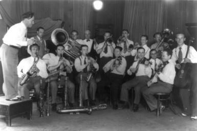 | Keywords: Shilkret directing Bain Collection (edited).jpg Victor recording director Nat Shilkret 1889-1982; extreme left conducting a radio or studio group of musicians in the 1920s Back row left to right Joe Green drums three unknown Mike Mosiello trumpet Harry Shilkret trumpet unknown Front row left to right three unknown Lou Raderman violin Pete Eisenberg violin Jack Shilkret piano Benny Posner violin and unknown Source for the majority of the identified musicians Nat Shilkrets's autobiography Sixty years in the music business Lanham Toronto Oxford 2005 Bain News Service photograph via Library of Congress website http //hdl loc gov/loc pnp/cph 3b01329; converted from TIFF to jpg border cropped and slightly changed in contrast before upload Not dated Probably 2nd half of the 1920s Unnamed photographer in employ of Bain News Service PD-Bain Cropped to show only trumpet player Mike Mosiello File Mike Mosiello Bain Collection jpg Nat Shilkret Orchestras from the United States Orchestral recording History of music recording |