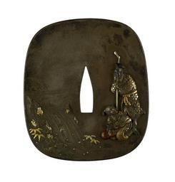 | Keywords: Shimamura Mitsuyoshi - Tsuba with K么sagi, a Paragon of Filial Piety - Walters 51373.jpg The man kneeling at the lower right of this tsuba is K魋agi one of the Japanese paragons of filial piety He worked hard every day to ensure there was enough money to buy his father some sake When times became hard he was unable to afford the sake despite his hard work When he was collecting water at a stream the gods revealed to him a waterfall which they turned into sake K魋agi is often depicted with a noble man here shown standing behind him K魋agi holds the gourd he is about to fill with sake The waterfall is at the lower left with bamboo leaves on the banks On the reverse of the tsuba is a scene of mountains and a pine tree ca 1875 late Edo-Meiji shibuichi gold cm 8 2 accession number 51 373 32646 Henry Walters Baltimore date and mode of acquisition unknown Walters Art Museum Henry Walters Acquired by Henry Walters Signature Mitsuyoshi place of origin Edo present-day Tokyo Japan Walters Art Museum license Tsuba in the Walters Art Museum Shimamura Mitsuyoshi Media contributed by the Walters Art Museum needs category review |