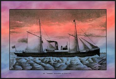 Keywords: ship freight ocean liner ss pioneer voyage seaworthy navigate navigation vessel merchant marine engineer naval antique vintage digital artwork ink watercolor art