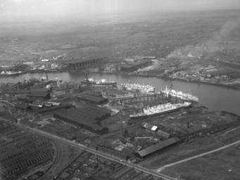 | Keywords: aerial photograph aerialphotograph south tyneside southtyneside hebburn palmers hebburn palmershebburn ship repairing shiprepairing dry dock drydock river tyne rivertyne blackandwhite monochrome outdoor black and white Aerial view of the Palmers ship repair yard, Hebburn, taken by Turners Ltd, May 1953 (TWAM ref. DT.TUR/2/9957B). The yard was owned by Vickers Armstrong Ltd. Tyne & Wear Archives is proud to present a series of aerial photographs of South Tyneside. These images were captured by the Newcastle-based photographic firm Turners Ltd. Many of the images reflect the district's rich industrial heritage, showing businesses and places that no longer exist. We would be delighted if you could help us to tag these by adding the names of streets and buildings that you recognise. Old photographs can often stimulate distant memories and we would also love to hear any reminiscences that these images inspire (Copyright) We're happy for you to share these digital images within the spirit of The Commons. Please cite 'Tyne & Wear Archives & Museums' when reusing. Certain restrictions on high quality reproductions and commercial use of the original physical version apply though; if you're unsure please email archives@twmuseums.org.uk Aerial view of the Palmers ship repair yard, Hebburn, taken by Turners Ltd, May 1953 (TWAM ref. DT.TUR/2/9957B). The yard was owned by Vickers Armstrong Ltd. Tyne & Wear Archives is proud to present a series of aerial photographs of South Tyneside. These images were captured by the Newcastle-based photographic firm Turners Ltd. Many of the images reflect the district's rich industrial heritage, showing businesses and places that no longer exist. We would be delighted if you could help us to tag these by adding the names of streets and buildings that you recognise. Old photographs can often stimulate distant memories and we would also love to hear any reminiscences that these images inspire (Copyright) We're happy for you to share these digital images within the spirit of The Commons. Please cite 'Tyne & Wear Archives & Museums' when reusing. Certain restrictions on high quality reproductions and commercial use of the original physical version apply though; if you're unsure please email archives@twmuseums.org.uk |