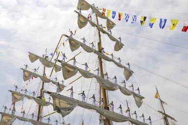 Keywords: ship sailing sailing-ship sailing vessel mexican men sailors manning the mast flags bay harbor water new york city buildings urban skyline architecture outside summer