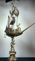 | Keywords: Ship-shaped vessel.jpg Artwork en Ship-shaped vessel pl Naczynie w kształcie statku Silver gilt cm 124 5 Moscow Kremlin Armoury en The vessel is supported by the statue of the Colossus of Rhodes and adorned with other figures baby Bacchus on the ship bow men and women animals cannons The main sail bears the emblem of the Polish-Lithuanian Commonwealth with the crest of the Vasa Dynasty in the center Object history s 1580 commission Sigismund III of Poland Warsaw own BurgererSF s 1580 Georgius Sporboth Sporboch Other versions West-european tableware in the Museums of Moscow Kremlin Silverware in Russia Goldsmithery from the Polish Vasa Collection Ships in sculpture Silver sculptures |