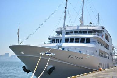 MAKE A MEME View Large Image ship tourist boats cruiser kobe concerto tourism sunny bow kobe port harborland mast bowline rope bowlines anchor ikari blue sky day japan mosaic garden mosaic