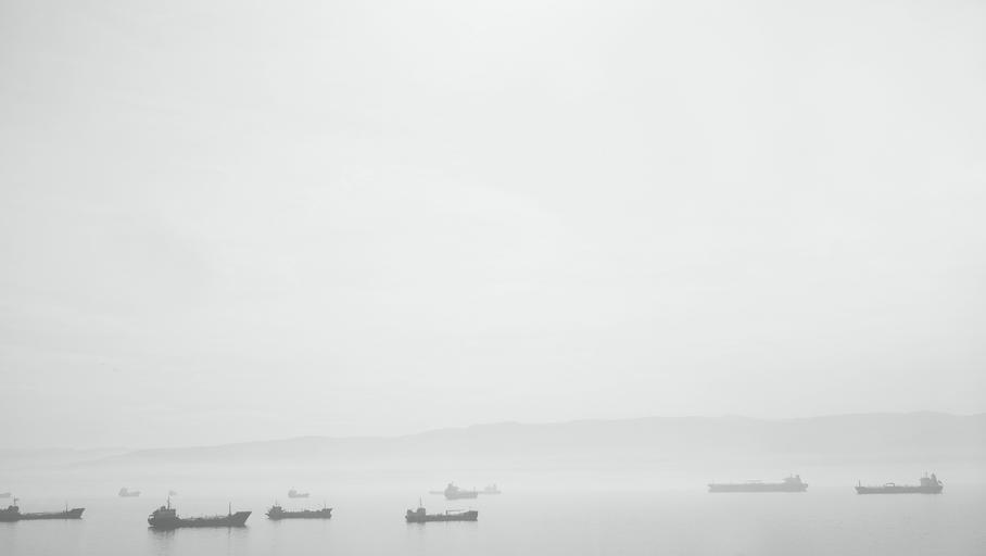Keywords: ships mist fog boats ocean coast sea mystical morning cloudy clouds black and white grey sky water steam haze