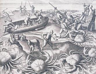 | Keywords: Shipwrecked Portuguese sailors battling giant crabs in the Indian Ocean.jpg en Like the giant gold-digging ants Herodotus described in the fifth century BC or this 16th-century depiction of shipwrecked Portuguese sailors battling giant crabs in the Indian Ocean the fantastic the strange and the astonishing have always been ascribed to whatever lands were little-known and distant For Europeans this was the East CAMBRIDGE UNIVERSITY LIBRARY BRY INDIA ORIENTALIS IV 1601 1601 http //www saudiaramcoworld com/issue/200504/the leek-green sea htm author PD-old-100 Uploaded with UploadWizard Ships of Portugal Theodor de Bry |
