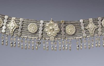 | Keywords: Shm Sharayan - Woman's Headband - Walters 572310 - Detail A.jpg The headband consists of a flexible interlaced silver band with square endpieces each with rosette-shaped knob that fastens the band inside the terminals The band is decorated with a large central rosette in the center which is combined with a smaller rosette and a dangle below Two smaller disk with rosettes on each side of the large central rosette are directly attached to the band In addition between end-pieces discs and the central rosette are four combinations of rhombic elements flanked by slim bars with a five-disc motif each of which is attached to a movable retainer The rhombic elements are decorated with smaller rhombs in the center enclosed by rings and disks The decoration of the attachments is made in filigree technique; the large central rosette is worked in repoussé Hanging down from the band are forty-five multi-element dangles which combine rings disks and small cuboids At the back of one endpiece is a stamp with the Arabic date nusfi 128 7 the term nusfi means half In this year al-Hadi Galib ruled in Sana a' but also Saykh Muhsin b Ali Mu'id It was one year before the second Ottoman occupation of Yemen began On the back of the other end-piece is an engraved Hebrew inscription that names the silversmith Shm uel Sharayan mahasit The term mahasit means half 1287 AH/AD 1870-1871 silver with gilding L 19 1/2 x W of end-pieces 1 1/2 in 49 5 x 3 8 cm accession number 57 2310 80914 Mr Benjamin Zucker Zucker Family Trust and Mr Derek Content New York and London by purchase Walters Art Museum Joint gift to the Walters Art Museum Baltimore and the Israel Museum Jerusalem by Mr Benjamin Zucker and Mr Derek Content in honor of Mrs Barbara Zucker and Mrs Amanda Content 2010 Stamp Arabic nusfi 128 7 AH Engraving Hebrew Sm uel Sarayan mahasit place of origin Raydah Yemen Walters Art Museum license Jewellery in the Walters Art Museum South Arabian art in the Walters Art Museum Shm Sharayan Media contributed by the Walters Art Museum needs category review |