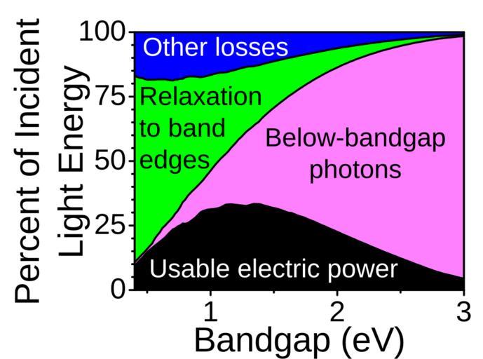 | Keywords: ShockleyQueisserBreakdown2.svg en The Shockley-Queisser limit for the maximum possible efficiency of a solar cell black and the inevitable losses that limit it other colors The black height is energy that can be extracted as useful electrical power; the pink height is energy of below-bandgap photons; the green height is energy lost when hot photogenerated electrons and holes relax to the band edges; the blue height is energy lost in the tradeoff between low radiative recombination versus high operating voltage The curves are all wiggly because of IR absorption bands in the atmosphere I used the actual AM1 5G solar spectrum data I cross-checked the black curve with independently-calculated ones and they agree to high accuracy http //www opticsinfobase org/abstract cfm URI OSE-2010-SWA1 http //www opticsinfobase org/abstract cfm URI OSE-2010-SWC4 The other curves besides the black curve are not published in exactly this form to my knowledge but it's a straightforward part of the same calculation own Sbyrnes321 2011-02-17 ShockleyQueisserBreakdown2 DE svg The data-file for this graph is freely available ask me at http //en wikipedia org/wiki/User_talk Sbyrnes321 I did the calculation in Mathematica the plotting in Origin and the PDF-->SVG conversion in Inkscape The Mathematica source code is posted on my website http //sjbyrnes com/ Cc-zero Photovoltaic power schemas and diagrams Solar cell schemas and diagrams |