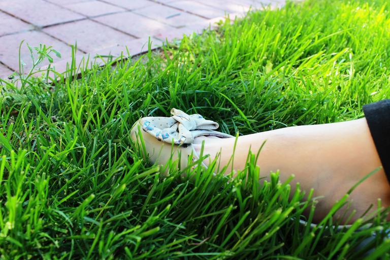 Keywords: shoe grass green footwear lifestyle summer outdoor person female young foot girl park