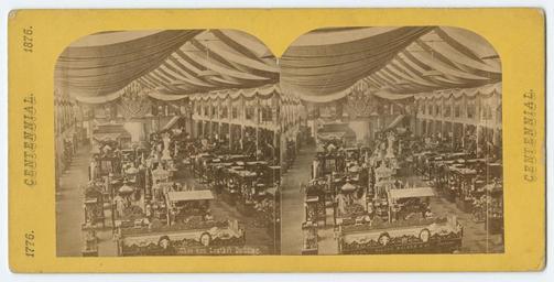 | Keywords: library company of philadelphia librarycompanyofphiladelphia centennial exhibition centennialexhibition stereographs philadelphia vendors shoe and leather building shoeandleatherbuilding Shows the interior of the Shoe and Leather Building on the grounds of the Centennial Exhibition of 1876 in Philadelphia, Pa. Rows of ornately-decorated vendor stalls are visible beneath a ceiling swathed with bunting. Accession number: P.2011.47.697 Shows the interior of the Shoe and Leather Building on the grounds of the Centennial Exhibition of 1876 in Philadelphia, Pa. Rows of ornately-decorated vendor stalls are visible beneath a ceiling swathed with bunting. Accession number: P.2011.47.697 |