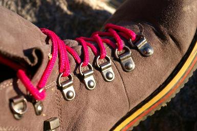 Keywords: shoe trekking eyelets sole shoelace hiking shoes shoe lace shoelaces bind tie shoes bicycle tour pink knot hiking rest break wanderer hike sit rest pause resting place trail relax click