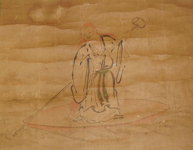 | Keywords: Shōjō.sake-cup.ladle.and.sea.detail.jpg en Detail shot from a painting of a Shōjō standing on an over-sized saucer-style sake cup using a very long-handled sake ladle to pole through a sea of what may be either sake or water Painting; sumi ink water colours on paper with what appear to be fine flecks of mica Signed sealed as by Kano Tsunenobu 1636-1713 ; unverified plausible research needed Painting is loosely Kano school at latest 19th century or earlier to accredited artist's lifetime Private collection; fam Wittig et cie Working print of detail from the painting for possible use in the relevant wikipedia articles - scans pending This is a working print please feel free to upload an improved edit of same photograph of painting taken by uploader signed sealed as by Kano Tsunenobu 1636-1713 18 or earlier to 1636-1713 period PD-old image set of painting Source photograph of painting taken by uploader Kano Tsunenobu Kano school paintings Sake cups Sake Shōjō Paintings of the Edo period Paintings on scrolls from Japan |