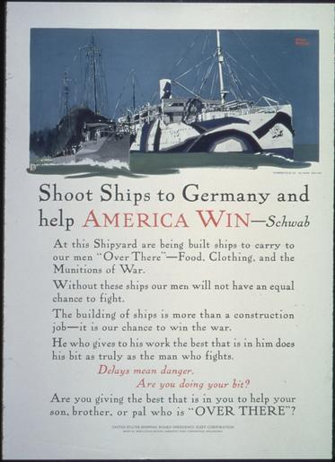 Keywords: Shoot Ships to Germany and help America Win- Schwab, ca. 1917 - ca. 1919 - NARA - 512484.tif Local identifier 4-P-45 U S Food Administration Educational Division Advertising Section 01/15/1918 - 01/1919 Still Picture Records Section Special Media Archives Services Division NWCS-S National Archives at College Park 8601 Adelphi Road College Park MD 20740-6001 other date circa 1917 1919 Record group Record Group 4 Records of the U S Food Administration 1917 - 1920 Record group ARC 333 World War I Posters compiled 1917 - 1919 Series ARC 512439 Variant control numbers NAIL Control Number NWDNS-4-P-45 General notes Scope and content Shoot Ships to Germany and help America Win- Schwab At this shipyard are being built ships to carry to our Over There - Food Clothing and the Munitions of War Without these ships our men will not have an equal chance to fight The building of ships is more than a construction job- it is our chance to win the war He who gives to his work the best that is in him does his bit as truly as the man who fights Delays mean danger Are you doing your bit Are you giving the best that is in you to help your son brother or pal who is Over There File unit File unit ARC yes <gallery> File Shoot_Ships_to_Germany_and_help_America_Win-_Schwab _ca _1917_-_ca _1919_-_NARA_-_512484 tif tif File Shoot_Ships_to_Germany_and_help_America_Win-_Schwab _ca _1917_-_ca _1919_-_NARA_-_512484 jpg jpg </gallery> NARA-cooperation PD-USGov Propaganda of advertising sections of the United States NARA TIF images with categorized JPGs |