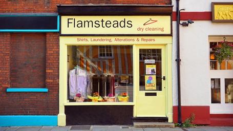 Keywords: shop street city outdoors urban street road outside dry cleaners england uk britain hertfordshire town yellow door window brick glass flamsteads dry cleaning