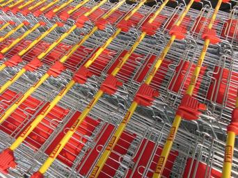 Keywords: shopping cart steel plastic chrome plated shiny nested close compact metal red yellow silver parallel pattern