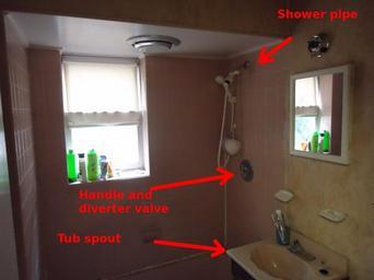 | Keywords: Shower diverter valve replacement project before work.jpg en A handyman project to redo pipes behind the shower The arrows point to parts that are old and worn and that will be replaced 2012-08-16 own Tomwsulcer cc-zero Uploaded with UploadWizard Handyman photos by tom sulcer Plumbing |