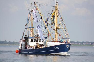 Keywords: shrimp port cutter north sea harbour festival boat parade flags husum nordfriesland sea ships fishing vessel water northern germany coast maritime nature