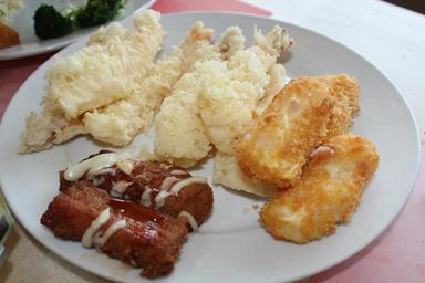 Keywords: food mix food sea foods tempura beef shrimp meat crab white plate