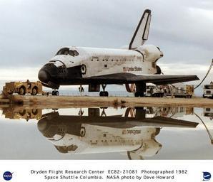 | Keywords: Shuttle Columbia Post-landing Tow - with Reflection in Water DVIDS687812.jpg en A rare rain allowed this reflection of the Space Shuttle Columbia as it was towed 16 Nov 1982 to the Shuttle Processing Area at NASA's Ames-Dryden Flight Research Facility from 1976 to 1981 and after 1994 the Dryden Flight Research Center Edwards California following its fifth flight in space Columbia was launched on mission STS-5 11 Nov 1982 and landed at Edwards Air Force Base on concrete runway 22 Space Shuttles are the main element of America's Space Transportation System and are used for space research and other space applications The shuttles are the first vehicles capable of being launched into space and returning to Earth on a routine basis Space Shuttles are used as orbiting laboratories in which scientists and mission specialists conduct a wide variety of scientific experiments Crews aboard shuttles place satellites in orbit rendezvous with satellites to carry out repair missions and return them to space and retrieve satellites and return them to Earth for refurbishment and reuse Space Shuttles are true aerospace vehicles They leave Earth and its atmosphere under rocket power provided by three liquid-propellant main engines withtwo solid-propellant boosters attached plus an external liquid-fuel tank After their orbital missions they streak back through the atmosphere and land like airplanes The returning shuttles however land like gliders without power and on runways Other rockets can place heavy payloads into orbit but they can only be used once Space Shuttles are designed to be continually reused When Space Shuttles are used to transport complete scientific laboratories into space the laboratories remain inside the payload bay throughout the mission They are then removed after the Space Shuttle returns to Earth and can be reused on future flights Some of these orbital laboratories like the Spacelab provide facilities for several specialists to conduct experiments in such fields as medicine astronomy and materials manufacturing Some types of satellites deployed by Space Shuttles include those involved in environmental and resources protection astronomy weather forecasting navigation oceanographic studies and other scientific fields The Space Shuttles can also launch spacecraft into orbits higher than the Shuttle's altitude limit through the use of Inertial Upper Stage IUS propulsion units After release from the Space Shuttle payload bay the IUS is ignited to carry the spacecraft into deep space The Space Shuttles are also being used to carry elements of the International Space Station into space where they are assembled in orbit The Space Shuttles were built by Rockwell International's Space Transportation Systems Division Downey California Rockwell's Rocketdyne Division now part of Boeing builds the three main engines and Thiokol Brigham City Utah makes the solid rocket booster motors MartinMarietta Corporation now Lockheed Martin New Orleans Louisiana makes the external tanks Each orbiter Space Shuttle is 121 feet long has a wingspan of 78 feet and a height of 57 feet The Space Shuttle is approximately the size of a DC-9 commercial airliner and can carry a payload of 65 000 pounds into orbit The payload bay is 60 feet long and 15 feet in diameter Each main engine is capable of producing a sea level thrust of 375 000 pounds and a vacuum orbital thrust of 470 000 pounds The engines burn a mixture of liquid oxygen and liquid hydrogen In orbit the Space Shuttles circle the earth at a speed of 17 500 miles per hour with each orbit taking about 90 minutes A Space Shuttle crew sees a sunrise or sunset every 45 minutes When Space Shuttle flights began in April 1981 Dryden Flight Research Center Edwards California was the primary landing site for the Shuttles Now Kennedy Space Center Florida is the primary landing site with Dryden remaining as the principal alternate landing site NASA Identifier NIX-EC82-21081 2009-09-23 Glenn Research Center https //www dvidshub net/image/687812 687812 2012-10-10 11 46 WASHINGTON DC US PD-USGov Space Shuttles at Edwards Air Force Base Images from DoD uploaded by Fæ |