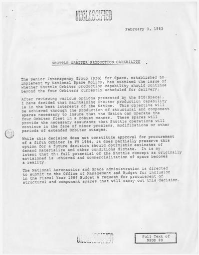 | Keywords: Shuttle Orbiter Production Capability - NARA - 198230.jpg Scope and content General notes 198230 Local identifier President 1981-1989 Reagan National Security Council 1981 - 1989 Ronald Reagan Library NLRR 40 Presidential Drive Simi Valley CA 93065-0600 1983-02-03 Record group Collection RR-NSC Numbered National Security Policy Papers 1981 - 1989 Record group ARC 1189 National Security Decision Directives compiled 02/25/1981 - 01/19/1989 Series ARC 198166 File unit File unit ARC Variant control numbers NAIL Control Number NLS-NSC-NSDD-80 Other versions <gallery> File Shuttle_Orbiter_Production_Capability_-_NARA_-_198230 tif tif File Shuttle_Orbiter_Production_Capability_-_NARA_-_198230 jpg jpg </gallery> NARA-cooperation PD-USGov Presidential Decision Directives Reagan |
