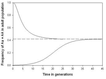 | Keywords: Sickle cell gene under selection.png en The calculated rate at which the frequency of a newly mutated sickle-cell gene will increase in a population exposed to intense malarial selection The change over generations in the sickle-cell heterozygote Aa + homozygote AA frequency in the adult population that would occur from a low level recent mutation or a high level unlikely founder event in a small population when the fitnesses of the normal homozygote sickle-cell heterozygote and sickle-cell homozygote are 0 95 1 19 and 0 30 respectively Based on data published in Allison AC 1955 Aspects of polymorphism in man Cold Spring Harb Symp Quant Biol 20 239-251 own TimVickers Sickle-cell anemia Population genetics |