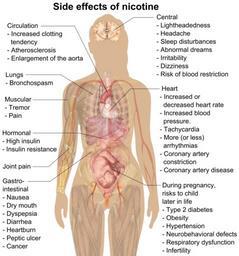 | Keywords: Side effects of nicotine.png en Main side effects of nicotine See Wikipedia Nicotine <P>To discuss image please see Talk Human body diagrams List format Circulation Increased clotting tendency<ref name Drugs com> cite web Nicotine Side Effects http //www drugs com/sfx/nicotine-side-effects html Drugs com 2009 </ref> Atherosclerosis<ref name Schraufnage2014> cite journal Schraufnagel Dean E Blasi Francesco Drummond M Bradley Lam David C L Latif Ehsan Rosen Mark J Sansores Raul Van Zyl-Smit Richard Electronic Cigarettes A Position Statement of the Forum of International Respiratory Societies American Journal of Respiratory and Critical Care Medicine 190 6 2014 611 “618 1073-449X 10 1164/rccm 201407-1198PP 25006874 </ref> Enlargement of the aorta<ref name Schraufnage2014/> Lungs Bronchospasm<ref name Drugs com/> Muscular Tremor<ref name Drugs com/> Pain<ref name Drugs com/> Gastrointestinal Nausea<ref name Drugs com/> Dry mouth<ref name Drugs com/> Dyspepsia<ref name Drugs com/> Diarrhea<ref name Drugs com/> Heartburn<ref name Drugs com/> Peptic ulcer<ref name Schraufnage2014/> Cancer<ref name Schraufnage2014/> Joint pain<ref name Drugs com/> Central Lightheadedness<ref name Drugs com/> Headache<ref name Drugs com/> Sleep disturbances<ref name Drugs com/> Abnormal dreams<ref name Drugs com/> Irritability<ref name Drugs com/> Dizziness<ref name Drugs com/> Risk of blood restriction<ref name Schraufnage2014/> Heart Increased or decreased heart rate<ref name Drugs com/> Increased blood pressure<ref name Drugs com/> Tachycardia<ref name Drugs com/> More or less arrhythmias<ref name Drugs com/> Coronary artery constriction<ref name Drugs com/> Coronary artery disease<ref name Schraufnage2014/> Hormonal High insulin<ref name Drugs com/> Insulin resistance<ref name Drugs com/> During pregnancy risks to child later in life Type 2 diabetes<ref name Schraufnage2014/> Obesity<ref name Schraufnage2014/> Hypertension<ref name Schraufnage2014/> Neurobehavioral defects<ref name Schraufnage2014/> Respiratory dysfunction<ref name Schraufnage2014/> Infertility<ref name Schraufnage2014/> Excluded are symptoms specific for a certain route of administration of nicotine where other factors than the nicotine itself may be responsible Excluded are also some very rare symptoms and symptoms that are only seen together with another relatively rare condition References reflist All used images are in public domain Mikael Häggström gallery of 2014 2009-11-03 Side effects of nicotine svg Human body diagrams Tobacco-related graphics PNG male shadow diagrams |
