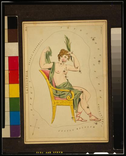 | Keywords: Sidney Hall - Urania's Mirror - Cassiopeia - original.tif File Sidney Hall - Urania's Mirror - Cassiopeia image right side up jpg Cassiopeia plate 3 in Urania's Mirror a set of celestial cards accompanied by A familiar treatise on astronomy by Jehoshaphat Aspin London Astronomical chart showing Perseus holding bloody sword and the severed head of Medusa forming the constellation 1 print on layered paper board etching hand-colored LOC-image cph 3g10052 1825 Creator Sidney Hall Richard Rouse Bloxam designer File Sidney Hall - Urania's Mirror - Cassiopeia image right side up jpg - Restoration - Image right side up JPEG File Sidney Hall - Urania's Mirror - Cassiopeia image right side up png - Restoration - Image right side up PNG File Sidney Hall - Urania's Mirror - Cassiopeia text right side up jpg - Restoration - Text right side up JPEG File Sidney Hall - Urania's Mirror - Cassiopeia text right side up png - Restoration - Text right side up PNG File Sidney Hall - Urania's Mirror - Cassiopeia - original tif - Original TIFF PD-old-100 Cassiopeia constellation Urania's Mirror Adam Cuerden's restorations |
