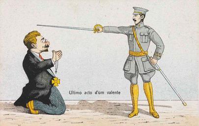 | Keywords: Sidónio Pais derrota Afonso Costa - 1918.png pt Bilhete postal com ilustração colorida caricaturando a subida de Sidónio Pais ao poder - como ditador - afastando por via de um golpe militar o governo do Partido Democrático de Afonso Costa - este surgindo com uma condecoração fantasiosa cuja banda alude à Ordem de Nossa Senhora da Conceição de Vila Viçosa Em legenda «Ultimo acto d´um valente» en Postcard with caricature of Sidónio Pais's rise to power - as a dictator - ousting through a military coup Afonso Costa's Democratic Party government Costa is the figure on its knees to the left with a fanciful decoration an alusion the Order of the Immaculate Conception of Vila Viçosa The inscription reads «The final act of a brave man » 1918 http //casacomum org/cc/visualizador pasta 09022 002 088 Casa Comum - Fundação Mário Soares author other versions PD-old-70-1923 1918 in Portugal Sidónio Pais Afonso Costa Caricatures of politicians of Portugal Uploaded with UploadWizard |