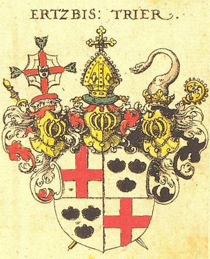 | Keywords: Siebmacher003-trier.jpg Erzbistum Trier 1605 Siebmachers Wappenbuch thumb left 1605 creator Johann Siebmacher Reproduction of a painting that is in the public domain because of its age PD-old-100 Siebmacher - Kurfuersten Lothar von Metternich Cross of Trier in heraldry Coats of arms of archbishops of the Roman Catholic Diocese of Trier Derivatives of the Coat of arms of Metternich family Derivatives of the Coat of arms of Trier diocese | ||||