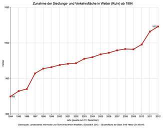 | Keywords: Siedlungs- und Verkehrsfläche Wetter (Ruhr) 1994-heute.png de Zunahme der Siedlungs- und Verkehrsfläche in der deutschen Gemeinde Wetter Ruhr ab 1994 “ absolute Angabe in Hektar jeweils zum 31 Dezember der Jahre “ Die Gesamtfläche der Stadt beläuft sich seit der Gebietsreform 1970 auf 3146 Hektar 31 46 km² own <br/>Data source/Datenquelle http //www landesdatenbank nrw de landesdatenbank nrw de Landesbetrieb Information und Technik NRW DĂĽsseldorf Holger1959 2013-09-16 Files by Holger1959 Statistics of Wetter Ruhr Land use in North Rhine-Westphalia |