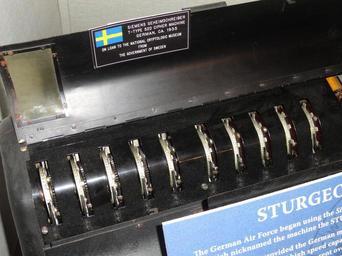 | Keywords: Siemens T-52D Geheimschreiber (STURGEON) cipher machine, c. 1935 - National Cryptologic Museum - DSC07887.JPG en Exhibit in the National Cryptologic Museum Fort Meade Maryland USA All items in this museum are unclassified; items created by the United States Government are not subject to copyright restrictions 2013-03-29 10 50 18 own Daderot cc-zero Uploaded with UploadWizard Siemens T-52 cipher machines in the National Cryptologic Museum | ||||