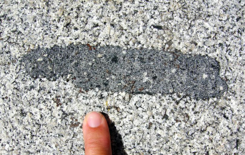 Keywords: SierraXenolith.JPG en Gabbro as a xenolith in a granite eastern Sierra Nevada Rock Creek Canyon California Own Wilson44691 2008-08 Photograph taken by Mark A Wilson Department of Geology The College of Wooster http //markwilson voices wooster edu/ Xenoliths |