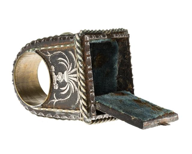 | Keywords: Sigillstamp, tidigt 1600-tal - Hallwylska museet - 110339.tif  LSH artwork sv Sigillstamp Rektangulär avsmalnande uppåt med från smalsidorna i båge rundad överända genom vilken ett stort runt hål skott med mässingsplåt på denna skrivet initialerna YG Dekor med inkrusteringar av silver i relief Undersida plan av en tjock skiva varpå instansat huset MEDICIS stamvapen avtryck se Planschverket i hjärtformig sköld mellan en palm- och en ekkvist samt under krona med sex spetsar och mittkors Florentin eller Medicé-kronan Skivan utgör fällock till ett rum och är rörlig på två tappar vid ena ändan vid den motsatta i mitten ett utspringande rundat tumfäste Rummet och skivans insida klädda med blå sammet något urblekt och delvis genomfrätt av rost På vardera smalsidan ett nedåtvänt vapenliknande ornament i konturerad sköld under krona med nio blad det på ena sidan med pålagda eldslågor det på andra sidan med en rund buckla; på den bågformade delen pålagt en blomma på vardera sidan en slät knopp mellan två rankornament; kring kanten en utstående tvärvågig list På vardera bredsidan nedanför hålet en kvinnlig bröstbild på vars huvud en kruka i denna en bladväxt; vid vardera kanten en list som på smalsidorna Nedtill kring ytterkanten pålagt nederst en grov repstav över denna två löst tvinnade band Kanterna och ramen kring locket vågigt fasade Formen medeltida med orneringen 1600-talets Huset MEDICI var ursprungligen en patriciersläkt från Florens av vilken en ättling COSIMO I 1569 av påven PIUS VI erhöll titeln storhertig av Toscana; svärdslinjen utslocknade 1737 varefter storhertigdömet tillföll huset Österrike Ättens stamvapen hade i guld 6 1 2 2 1 röda kulor av somliga tolkade som medicinpiller och av andra som bloddroppar Senare -1466- fick PIETRO DE MEDICI av konung LOUIS XI av Frankrike som ynnestbevis övre kulan ändrad blå i stället för röd och belagd med tre franska liljor vilket vapen finge föras blott av hans efterkommande men snart nog antogs av alla medlemmarna av ätten Den på senare vapen förekommande hjälmprydnaden med Flórentin-kronan taggig på mellersta spetsen en gyllene eller röd lilja varpå en falk tillkom 1531 original caption Sigillstamp tidigt 1600-tal <br/> Nyckelord Sigill Sigillstamp Föremålsbild Järn early other date century 17 silver - iron - brass size cm 5 5 g 126 5 size cm 4 nedtill size cm 4 3 nedtill HWY place of origin IT original filename hm_dig24387 16765 inventory number HWY XXXVIII I b 01 110339 CC-BY-SA Helena Bonnevier <gallery caption Different images of same object > File Sigillstamp med huset Medicis stamvapen 1600-tal - Hallwylska museet - 110338 tif </gallery> Signets Iron Seals Accessories Helena Bonnevier Media contributed by LSH dim-with multiple size templates Media contributed by LSH 2016-12 |