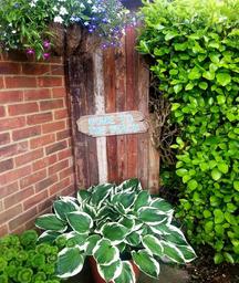 Keywords: sign door wall entrance closed building bricks plants flowers house exterior gate doorway wooden outdoor