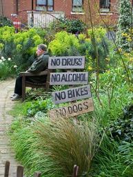 Keywords: sign garden no phoenix gardens camden london plant green park warning message man sitting resting