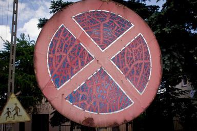 Keywords: sign road sign old sign traffic marking street warning stop characters mark pole road road signs designation of the information detained and parking ban no stopping no waiting