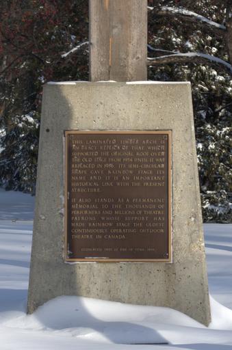 | Keywords: Signage for laminated timber arch outside of Rainbow Stage in Kildonan Park (Winnipeg, Manitoba).jpg en Signage for laminated timber arch outside of Rainbow Stage in Kildonan Park Winnipeg Manitoba Text on the sign reads This laminated timber arch is an exact replica of that which supported the original roof over the old stage from 1954 until it was replaced in 1986 Its semi-circular shape gave Rainbow Stage its name and it is an important historical link with the present structure It also stands as a permanent memorial to the thousands of performers and millions of theatre patrons whose support has made Rainbow Stage the oldest continuously operating outdoor theatre in Canada Dedicated this 22 day of June 1988 2013-01-12 13 46 49 own Ccyyrree 49 941792 -97 100304 cc-zero Rainbow Stage Uploaded with UploadWizard Public art in Winnipeg Plaques in Winnipeg January 2013 in Canada 2013 in Winnipeg Winter in Winnipeg |