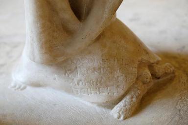 | Keywords: Signature Marcellus Louvre Ma1207.jpg Detail of signature on a statue of Marcellus formerly known as Germanicus of the Hermes Ludovisi type Greek marble Roman artwork of the 1st century CE after a 5th century BC prototype with substitution of a Roman portrait head Détail de la signature sur la statue de Marcellus précédemment identifiée comme « Germanicus » du type d'Hermès Ludovisi Marbre grec œuvre romaine du Ier siècle ap J -C d'après un type grec du Ve siècle av J -C avec substitution d'un portrait romain H 1 8 m 5 ft 10 ¾ in Museum Louvre Department of Greek Etruscan and Roman Antiquities Denon wing ground floor room 23 object history credit line From the villa of Pope Sixtus V in the Esquiline Hill then the Villa Montalto-Negroni; purchased by Louis XIV in 1664 and installed in the gardens of Versailles; transfered to the Napoleon Museum in 1802 accession number Ma 1207 MR 315 Jastrow 2007 other versions <gallery> Image Drapery Marcellus Louvre Ma1207 jpg Image Back Marcellus Louvre Ma1207 jpg </gallery> Ancient Greek inscriptions in France Marcellus as Hermes Signatures in ancient Greek sculptures |
