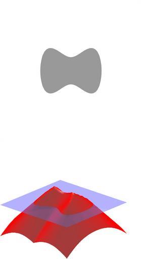| Keywords: Signed distance2.png Made by myself with Matlab 2007-03-01 own assumed Oleg Alexandrov Created with MATLAB Source code MATLAB <source lang matlab > function main init stuff M 3; lw 2 5; h 0 1; ii sqrt -1 ; XX -M h M; YY -M h M; X Y meshgrid XX YY ; the surfce determining the contour type 2; the contour is a circle for type 1 and something more complex otherwise if type 1 height 2; Z height - X 2-Y 2; else height 0 7; Z height-0 5 X-1 78 X 2 X+1 78 -Y 2; Z f X Y -surface end find the contour figure 1 ; subplot 2 1 1 ; figure 1 ; clf; C H contour X Y Z 0 0 ; set H 'linewidth' lw 'EdgeColor' 0;0;156/256 ; draw the region inside the contour figure 1 ; subplot 2 1 1 ; figure 1 ; clf; hold on; axis equal; axis off; l C 2 1 ; CX C 1 2 l+1 ; CY C 2 2 l+1 ; get x and y of contours H fill CX CY 0 6 1 1 1 ; set H 'EdgeColor' 'none' ; draw the shap a hack to make the box look bigger white 0 99 1 1 1; scale 1 4; plot -scale M -scale M ' ' 'color' white plot scale M scale M ' ' 'color' white calc the unsigned distance function Dist 0 Z+1000; for i 1 length XX for j 1 length YY x X i j ; y Y i j ; for k 1 length CX x0 CX k ; y0 CY k ; Dist i j min Dist i j sqrt x-x0 2+ y-y0 2 ; end end end signed distance Dist sign Z Dist; draw the signed distance figure 1 ; subplot 2 1 2 ; figure 2 ; clf; hold on; axis equal; axis off; surf X Y Dist 'FaceColor' 'red' 'EdgeColor' 'none' 'FaceAlpha' 1 ; draw the x-y plane the intersection of the surface above and this plane is the contour of our set surf X Y zeros length XX length YY 'FaceColor' 'blue' 'EdgeColor' 'none' 'FaceAlpha' 0 4 camlight left;lighting phong; make nice lightning view 42 22 angle of view polar coordinates save to file figure 1 ; saveas gcf sprintf 'Set d eps' type 'psc2' ; figure 2 ; saveas gcf sprintf 'Function d eps' type 'psc2' ; then use the following to convert to png convert -append Set2 eps Function2 eps signed_distance2 png </source> Images with Matlab source code Geometric intersections Surface plots Files by User Oleg Alexandrov from en wikipedia math |