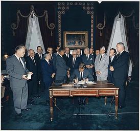 | Keywords: nara:arcid=194230 u.s. national archives usnationalarchives today's document todaysdocument october signing of the nuclear test ban treaty signingofthenucleartestbantreaty Title: Signing of the Nuclear Test Ban Treaty, 10/07/1963 Creator(s): President (1961-1963 : Kennedy). Office of the Naval Aide to the President. (1961 - 1963) Persistent URL: arcweb.archives.gov/arc/action/ExternalIdSearch?id=194230 President Johnson. (second row) unidentified man, Senator Mike Mansfield, John J. McCloy, unidentified man, W. Averell Harriman, Senator George Smathers, Secretary of State Dean Rusk, Senator Hubert Humphrey, William C. Foster, Senator Howard W. Cannon. White House, Treaty Room. (ARC ID 194230); Series: Robert Knudsen White House Photographs, 01/20/1961 - 12/19/1963; Collection JFK-WHP: White House Photographs, 12/19/1960 - 03/11/1964; John F. Kennedy Library (NLJFK); National Archives and Records Administration. Access Restrictions: Unrestricted Use Restrictions: Unrestricted Title: Signing of the Nuclear Test Ban Treaty, 10/07/1963 Creator(s): President (1961-1963 : Kennedy). Office of the Naval Aide to the President. (1961 - 1963) Persistent URL: arcweb.archives.gov/arc/action/ExternalIdSearch?id=194230 President Johnson. (second row) unidentified man, Senator Mike Mansfield, John J. McCloy, unidentified man, W. Averell Harriman, Senator George Smathers, Secretary of State Dean Rusk, Senator Hubert Humphrey, William C. Foster, Senator Howard W. Cannon. White House, Treaty Room. (ARC ID 194230); Series: Robert Knudsen White House Photographs, 01/20/1961 - 12/19/1963; Collection JFK-WHP: White House Photographs, 12/19/1960 - 03/11/1964; John F. Kennedy Library (NLJFK); National Archives and Records Administration. Access Restrictions: Unrestricted Use Restrictions: Unrestricted |