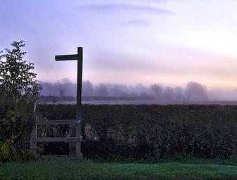 Keywords: signpost dawn morning misty mist nature countryside wooden sign stile rural hedge fields trees autumn sunrise