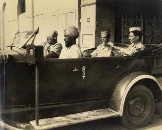 | Keywords: Sikh taxi-driver and co-pilot with American GIs in Calcutta in 1945.jpg Of Calcutta's assortment of colorful and intriguing characters the sikh taxi-driver and his co-pilot rank high The co-pilot was added in 1944 following an affray in which a soldier knifed a driver The two GI's shown here are doing their best to convey their destination to the driver of the ancient jalopy The South Asia Section of the Van Pelt Library University of Pennsylvania recently acquired from a bookdealer a photograph album consisting of 60 photographs of Calcutta taken most likely between 1945-1946 The photographer Mr Clyde Waddell also provided the interesting glosses accompanying each photograph Several attested copies of this work has emerged including one with a 'title page' held by the Southeastern Louisiana University in Hammond Louisiana Mr Waddell was a military photographer Many of his captions sound like annotations that would be found in a typical military magazine The album begins with several general long shots of Calcutta and ends with a picture of dhobi-s washermen washing clothes The text accompanying the last photograph also sounds as if the author intended to finish with that picture of one of the great mysteries of India The annotations have been included because of their intrinsic interest not only to the photographs but to a 'typical' American impression of India at this time 1945 http //www library upenn edu/collections/sasia/calcutta1947/ Clyde Waddell other versions PD-USGov Van Pelt Library University of Pennsylvania - Clyde Waddell Calcutta 1940's photos Uploaded with UploadWizard Sikh men from India |