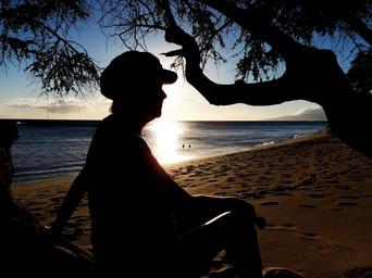 Keywords: silhouette beach sea ocean sand tropical paradise shore island tranquil relax calm sitting