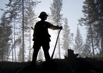Keywords: forest trees woods person silhouette standing firefighter alone isolated sky landscape nature outside fireman