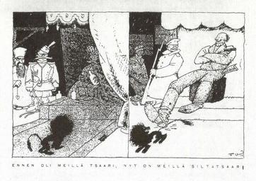 | Keywords: Siltatsaari.jpg en Before we had the czar now we have the Siltatsaari Silta-czar ; right-wing caricaturist Topi Vikstedt thought that the left wing of labour movement which had its headquarters in Helsinki's Siltasaari had replaced the Russian czar as the main opressor of Finland “ and was possibly worse Published in Finnish humour magazine Kerberos fi Oikeiston näkemystä edustavassa Topi Vikstedtin pilakuvassa työväenliikkeen siltasaarelaiset ovat korvanneet tsaarin Suomen sortajina “ ollen mahdollisesti vielä pahempia Julkaistu Kerberos-pilalehden joulunumerossa 1917-12 Marja Ylönen Pilahistoria Suomi poliittisissa pilapiirroksissa 1800-luvulta 2000-luvulle SKS Helsinki 2001; s 146 Topi Vikstedt 1891 “1930 PD-old Uploaded with UploadWizard Caricatures of Finland Political history of Finland Topi Vikstedt |